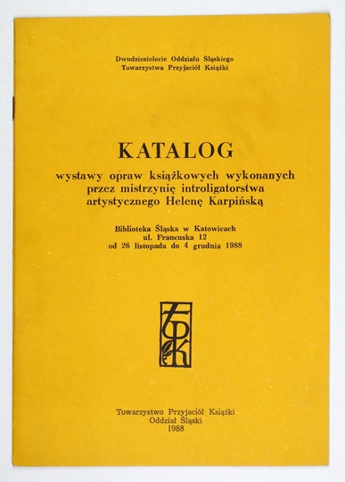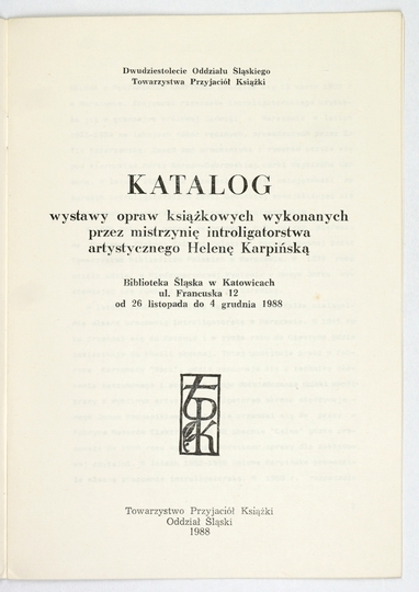 [KARPIŃSKA Helena]. Katalog wystawy opraw książkowych wykonanych przez mistrzynię introligatorstwa artystycznego Helenę Karpińską. Biblioteka Śląska w Katowicach. Katowice 1988. Tow. Przyjaciół Książki. 8, s. 9, [2]. brosz.