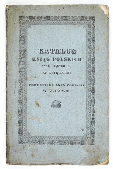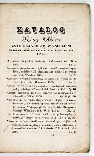KATALOG ksiąg polskich znajdujących się w księgarni przy ulicy ś. Anny pod l. 311. w Krakowie. Kraków 1840. Druk. J. Czecha. 16d, s. 184. brosz.