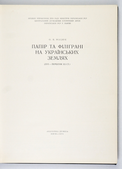 MACJUK O[rest] J[aroslavovyč] – Papir ta filigrani na ukrainskych zemljach (XVI-počatok XX st.). Kyiv 1974. Naukova Dumka. 4, s. 292, [4]. opr. oryg. pł.
