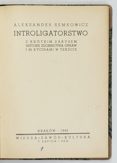 SEMKOWICZ Aleksander – Introligatorstwo z krótkim zarysem historii zdobnictwa opraw i 89 ryc. w tekście. Kraków 1948. Wiedza, Zawód, Kultura. 8, s. 190, [1]. opr. ppł. z epoki.