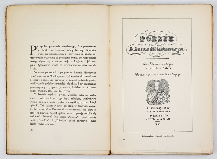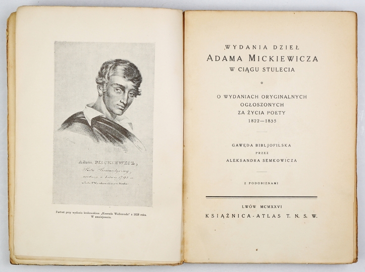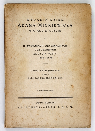 SEMKOWICZ Aleksander – Wydania dzieł Adama Mickiewicza w ciągu stulecia. O wydaniach oryginalnych ogłoszonych za życia poety 1822-1855. Gawęda bibljofilska. Z podobiznami. Lwów 1926. Książnica-Atlas. 8, s. [8], 230, tabl. 1. brosz.