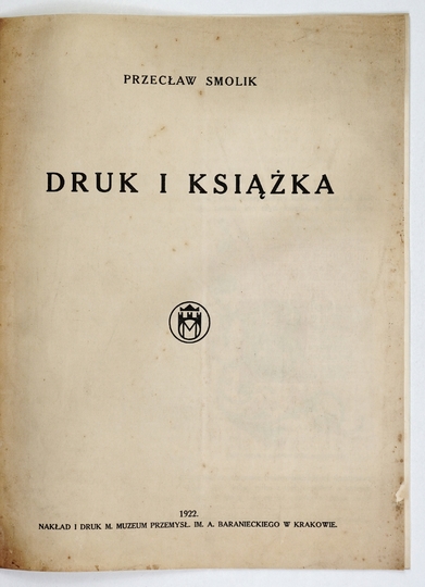 SMOLIK Przecław – Druk i książka. Kraków 1922. Muzeum Przemysłowe. 4, s. [2], 13, [1]. brosz. wt.