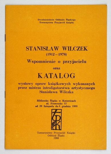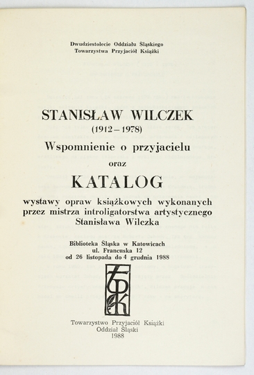 [WILCZEK Stanisław]. Stanisław Wilczek (1912-1978). Wspomnienie o przyjacielu oraz Katalog wystawy opraw książkowych wykonanych przez mistrza introligatorstwa artystycznego Stanisława Wilczka. Biblioteka Śląska w Katowicach. Katowice 1988. Tow. Przyjaciół Książki. 8, s. 17, [2]. brosz.