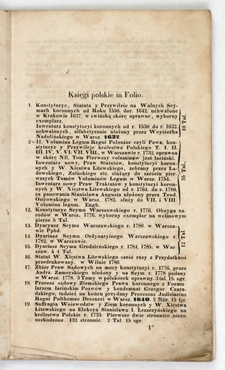 WYKAZ dzieł nader rzadkich i ważnych, tudzież manuskryptów, autografów, tyczących się historji i literatury polskiej, wraz krajobrazów, miedziorytów sławnych Polaków, które w księgarni i składzie sztuk pięknych J[ózefa] Lissnera [...] za umiarkowaną cenę są do nabycia. Poznań 1846. J. Lissner. 16d, s. 75, [1]. brosz.