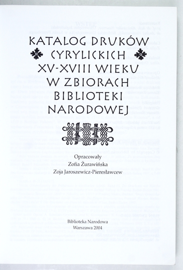 ŻURAWIŃSKA Zofia, JAROSZEWICZ-PIERESŁAWCEW Zoja – Katalog druków cyrylickich XV-XVIII wieku w zbiorach Biblioteki Narodowej. Oprac. ... . Warszawa 2004. Bibliot. Narodowa. 8, s. 362, [2], ilustr. 61. brosz.