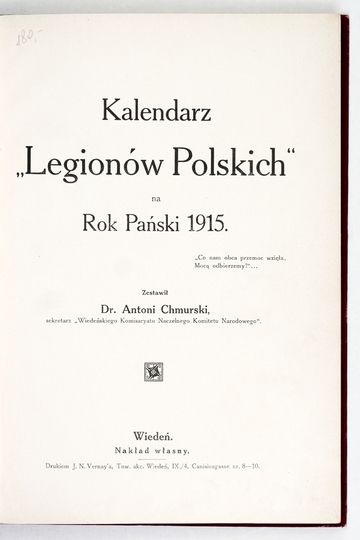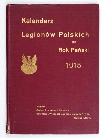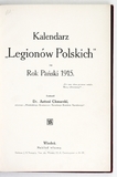 KALENDARZ "Legionów Polskich" na Rok Pański 1915. Zestawił Antoni Chmurski. Wiedeń. Nakł. "Wiedeńskiego Kurjera Pol.". 8, s. 158, [10]. opr. oryg. pł. zdob.