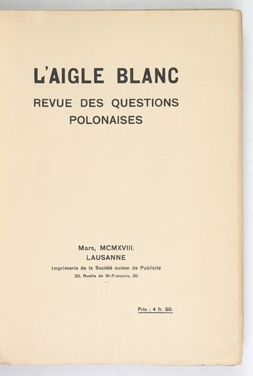 L'AIGLE Blanc. Revue des questions polonaises. Lausanne. Edit. H. Ratynski.4. brosz.