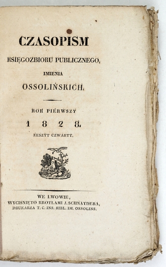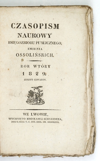 CZASOPISM Naukowy Księgozbioru Publicznego, imienia Ossolińskich. Lwów. Red. F. Siarczyński. Wyciśnięto krotłami J. Schnaydera. 8. brosz.