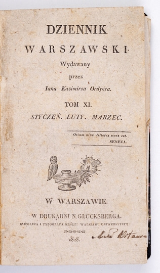 DZIENNIK Warszawski wydawany przez Jana Kazimierza Ordyńca. Warszawa. Druk. N. Glücksberga. 16d. razem opr. późn. bibliot. ppł.
