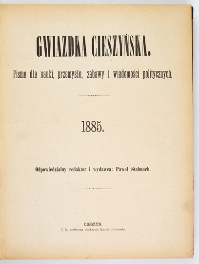 GWIAZDKA Cieszyńska. Pismo dla nauki, przemysłu, zabawy i wiadomości politycznych. Cieszyn. Wyd. i red. Paweł Stalmach. Druk. K. Prochaski. 4. opr. bibliot. ppł. z epoki.