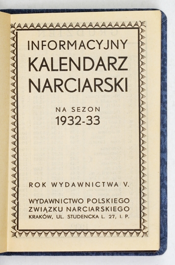 [KALENDARZ]. Informacyjny Kalendarz Narciarski na sezon 1932-33. Rok wydawnictwa 5. Kraków. Polski Związek Narciarski. 16, s. 136, [24]. opr. oryg. pł.