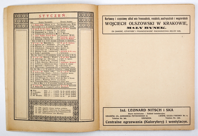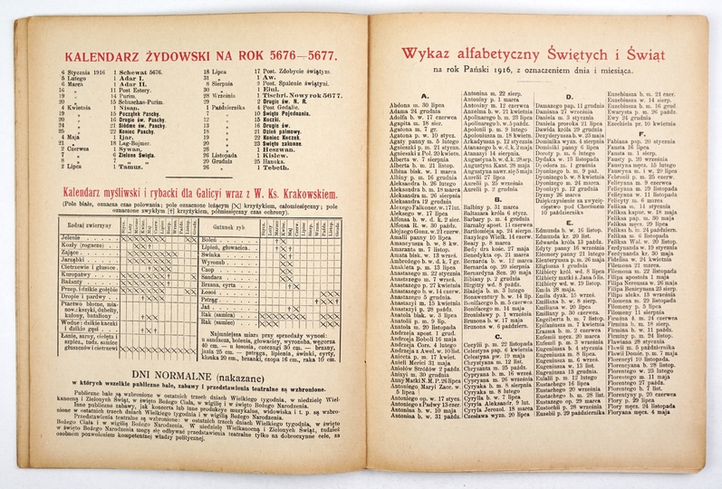 KALENDARZ krakowski Józefa Czecha na rok 1916. [R.] 85. Kraków. Tow. Miłośników Historii i Zabytków Krakowa. 8, s. [24], 96, 32, tabl. 2. brosz.