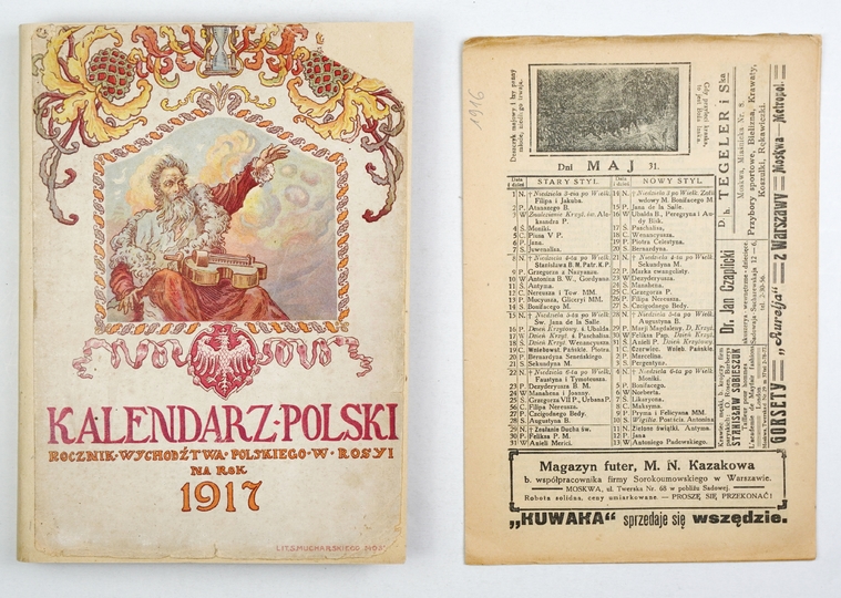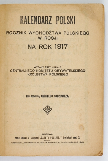 KALENDARZ polski. Rocznik wychodźtwa polskiego w Rosji na rok 1917. Pod red. Antoniego Sadzewicza. Moskwa. Centralny Komitet Obywatelski Królestwa Pol. 8, s. [32], XXIV, 261, [3], 16, tabl. 20. brosz. wt.