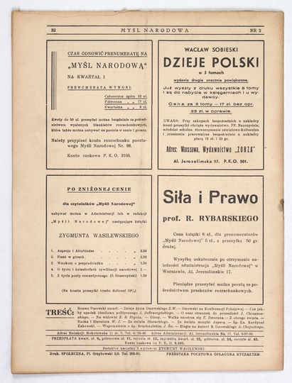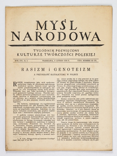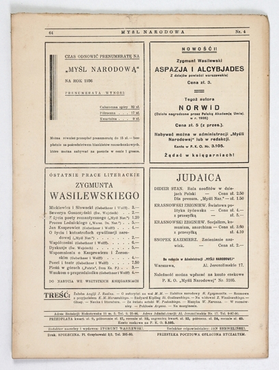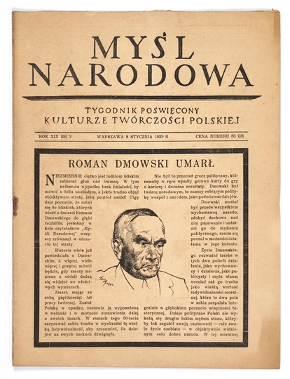 MYŚL Narodowa. Tygodnik poświęcony kulturze twórczości polskiej. Warszawa. Red. Z. Wasilewski. 4. numery luzem.