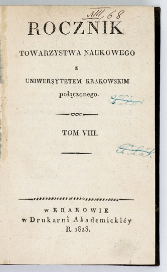 ROCZNIK Towarzystwa Naukowego z Uniwersytetem Krakowskim Połączonego. T. 8. Kraków. 1821. Druk. Akademicka. 16d, s. [4], 376, [1]. opr. bibliot. ppł.