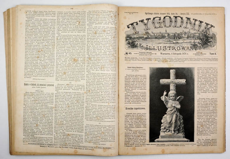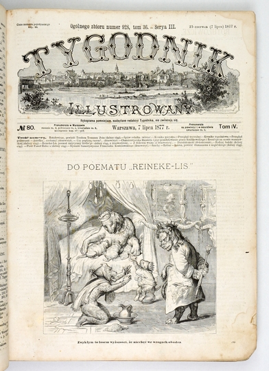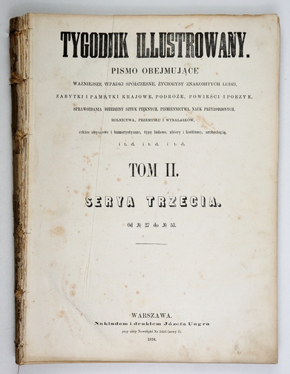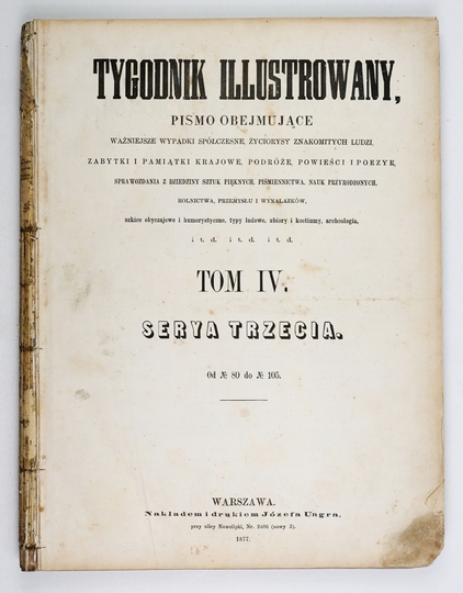 TYGODNIK Illustrowany. Pismo obejmujące ważniejsze wypadki spółczesne, życiorysy znakomitych ludzi, zbytki i pamiątki krajowe, podróże, powieści i poezye [...]. Warszawa. Nakł. J. Ungra. 4. bez oprawy.