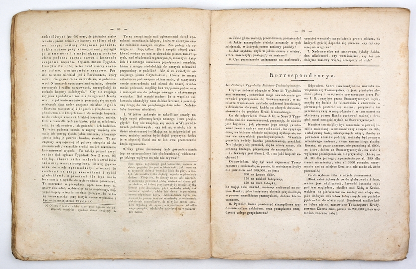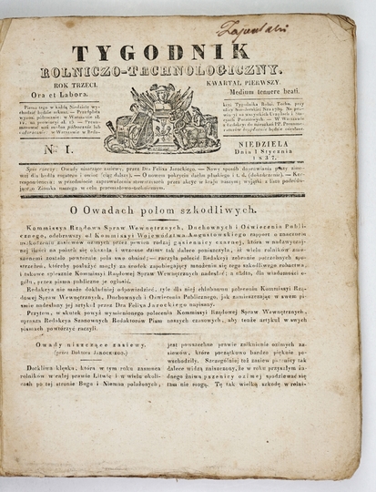 TYGODNIK Rolniczo-Technologiczny obejmujący rolnictwo, gospodarstwo domowe, leśnictwo, ogrodnictwo, technologię wiejską, chemię, fizykę i mechanikę rolniczą, tudzież różne przedmioty. Warszawa. Red. N. Kurowski. 4, opr. kart. z epoki, okł. brosz. naklejona na oprawę.