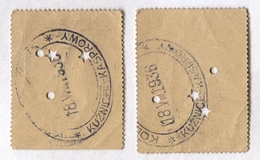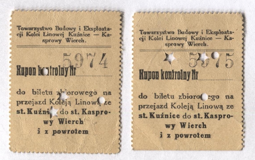 [KOLEJ linowa Kuźnice-Kasprowy Wierch, dwa bilety]. Dwa kupony kontrolne do biletu zbiorowego na przejazd Koleją Linową ze st. Kuźnice do st. Kasprowy Wierch i z powrotem, wykorzystane 18 VIII 1936.