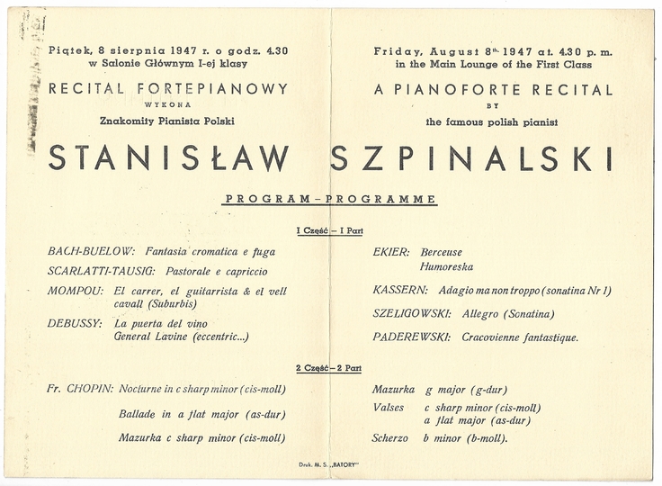 [M/S BATORY]. Program koncertu fortepianowego prezentowanego na pokładzie M/S Batory dn. 8 VIII 1947.