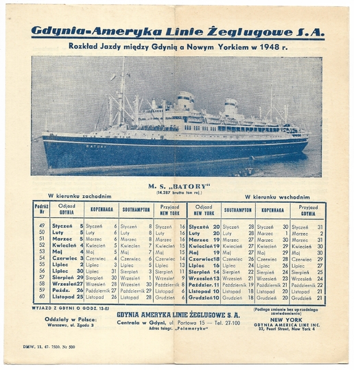 [M/S BATORY]. Ogólna instrukcja dla pasażerów wyjeżdżających z Polski na pokładzie M/S Batory z 1948.