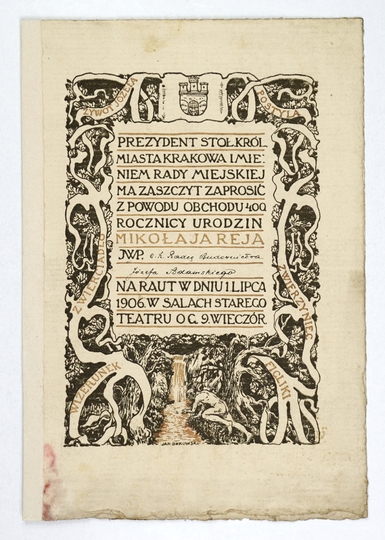[BUKOWSKI Jan, zaproszenie]. Prezydent m. Krakowa w imieniu Rady Miejskiej zaprasza na obchody 400 rocznicy urodzin Mikołaja Reja dn. 1 VII 1906 w salach Starego Teatru.