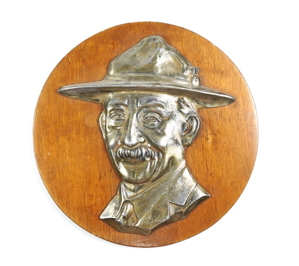 [HARCERSTWO]. Reliefowy portret Roberta Baden-Powella wykonany w białym metalu, zamocowany na okrągłym drewnianym podkładzie.