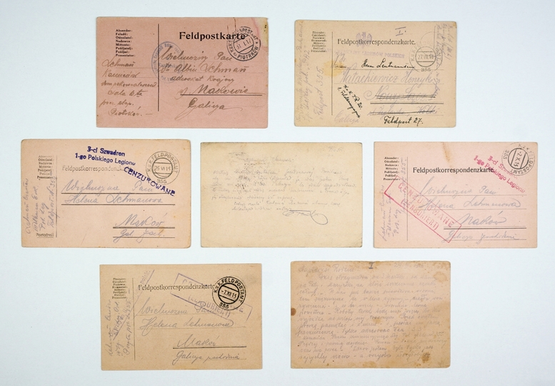 [KORESPONDENCJA legionowa]. Zestaw 7 kart korespondencyjnych z l. 1915-1917 opatrzonych pieczęciami formacji Legionów Polskich.