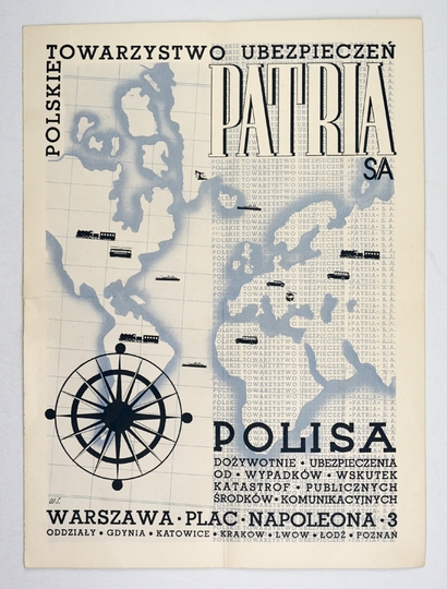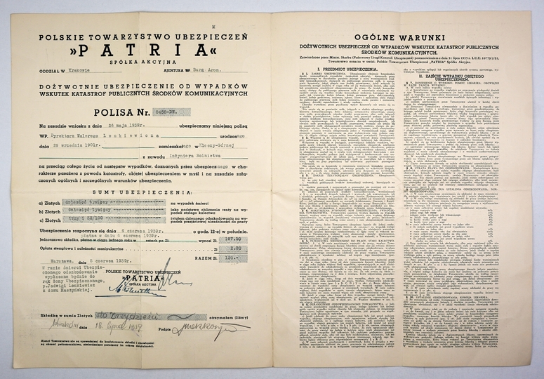 [POLISA ubezpieczeniowa]. Polskie Towarzystwo Ubezpieczeniowe Patria SA. Polisa, dożywotnie ubezpieczenia od wypadków wskutek katastrof publicznych środków komunikacyjnych. 1939.