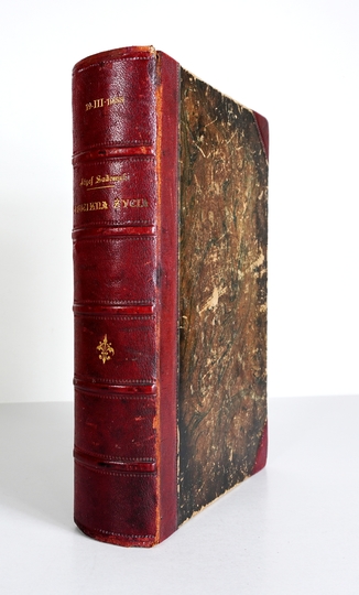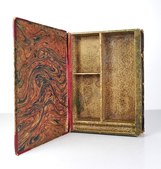 [SKRYTKA w książce]. Kaseta imitująca książkę w oprawie półskórkowej z lat 30. XX w.