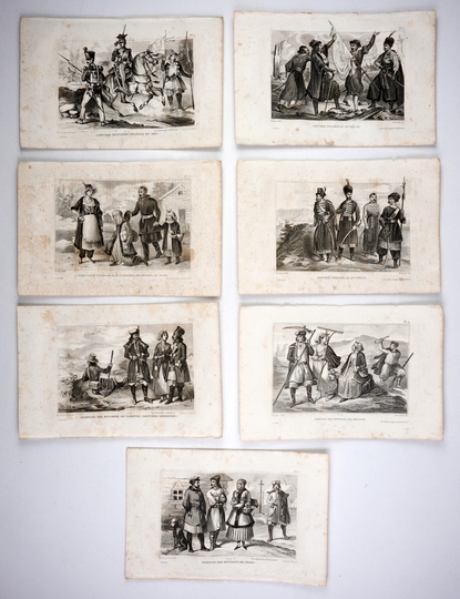 [STROJE polskie]. Siedem stalorytowych tablic kostiumowych dotyczących Polski pochodzących z pracy "Costumes traditionnels dans le monde" (Paryż 1850).