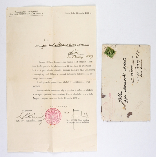 [TOWARZYSTWO Przyjaciół Korpusu Kadetów Nr. 1 we Lwowie]. Pismo do Adama Morawskiego z informacją o wpisaniu go w poczet członków założycieli, dat. 22 V 1932 we Lwowie.