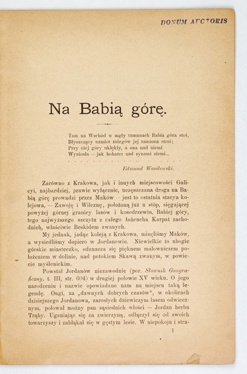 UŁASZYN Henryk – Na Babią górę. [Kraków] 1901. 8, s. 20. brosz. wt. Odb. z "Przeglądu Polskiego".