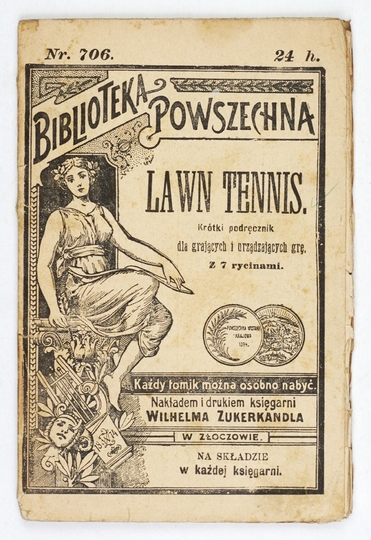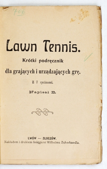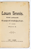 LAWN Tennis. Krótki podręcznik dla grających i urządzających grę. Z 7 rycinami. Napisał B. Lwów-Złoczów [1908]. W. Zukerkandel. 16d, s. V, [6]-50, [1]. brosz. Biblot. Powszechna, nr 706.
