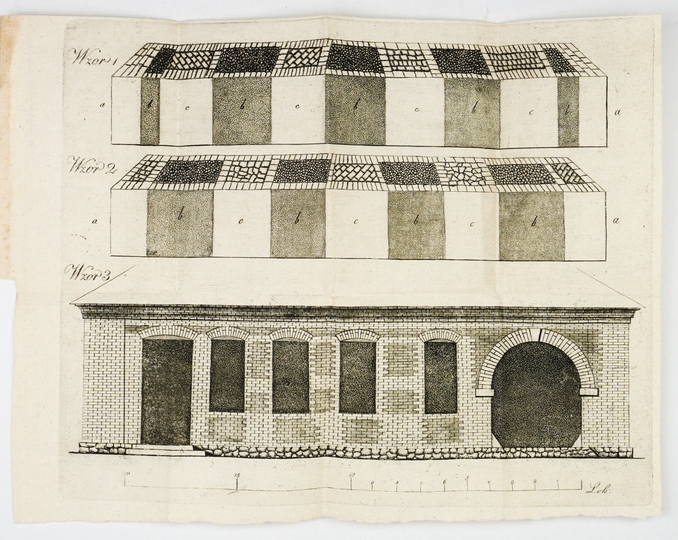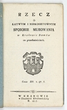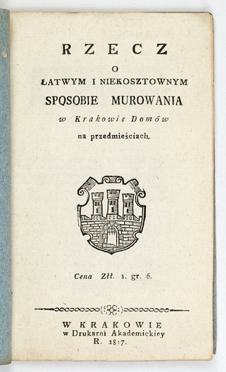 [SIERAKOWSKI Sebastian] – Rzecz o łatwym i niekosztownym sposobie murowania w Krakowie domów na przedmieściach. Kraków 1817. Druk. Akademicka. 16d, s. [2], 15, tabl. rozkł. 1. brosz.