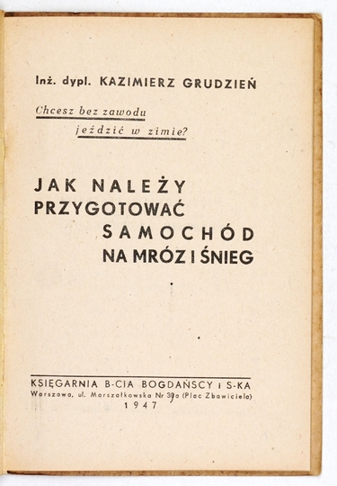 GRUDZIEŃ Kazimierz – Jak należy przygotować samochód na mróz i śnieg. Warszawa 1947. Księg. B-ca Bogdańscy i S-ka. 16d, s. 64. brosz.