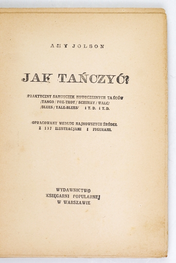 JOLSON Amy – Jak tańczyć? Praktyczny samouczek nowoczesnych tańców. Tango, fox-trot, schimmy [!], walc, blues, Yale-blues i t. d. i t. d. Opracowany według najnowszych źródrł. Z 137 ilustracjami i figurami. Warszawa 1935. Wyd. Księgarni Popularnej. 8, s. 146, [5]. brosz.