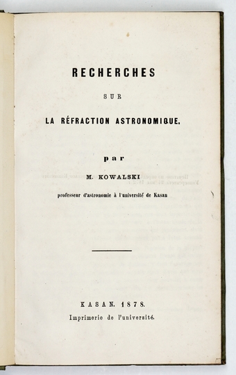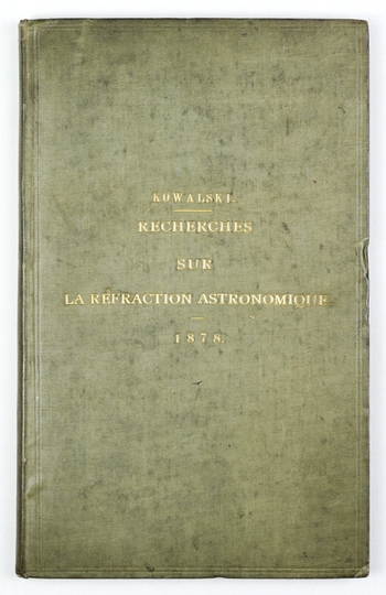 KOWALSKI M[arian] – Recherches sur la réfraction astronomique. Kasan [= Kazań] 1878. Imprim. de l'université. 8, s. XI, [1], 172, [2], II. opr. pł. z epoki., obcięcie prószone.