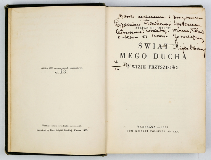 OSSOWIECKI Stefan – Świat mego ducha i wizje przyszłości. Warszawa 1933. Dom Książki Pol. 8, s. 367, [1], tabl. 4. opr. oryg. pł.