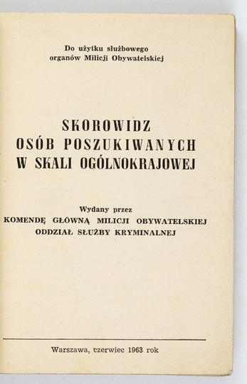 SKOROWIDZ osób poszukiwanych w skali ogólnokrajowej. Warszawa, VI 1963. Komenda Główna Milicji Obywatelskiej, Oddział Służby Kryminalnej. 16d, s. 332. brosz.