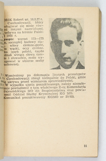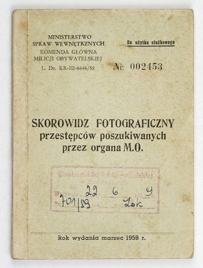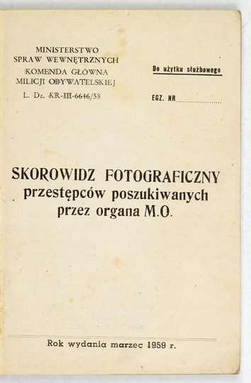 SKOROWIDZ fotograficzny przestępców poszukiwanych przez organa M.O. Warszawa, III 1959. Komenda Główna Milicji Obywatelskiej. 16d, s. 104. brosz.