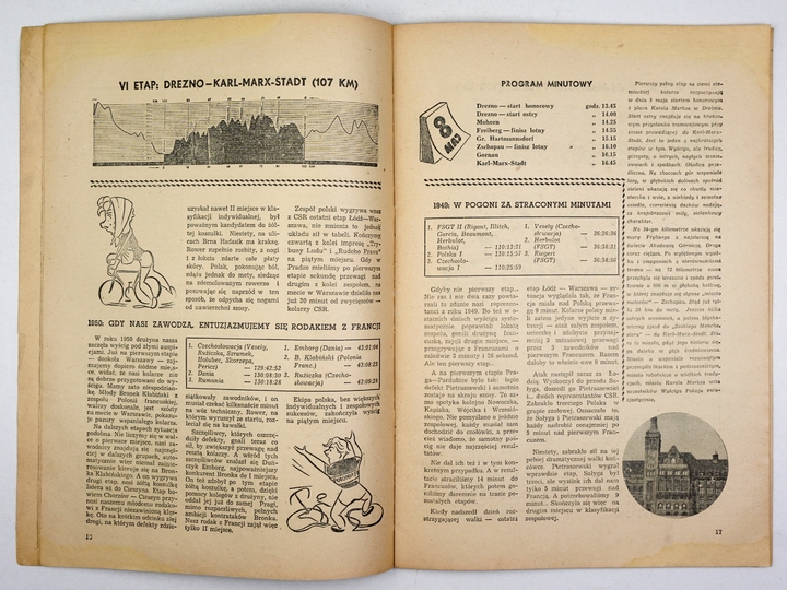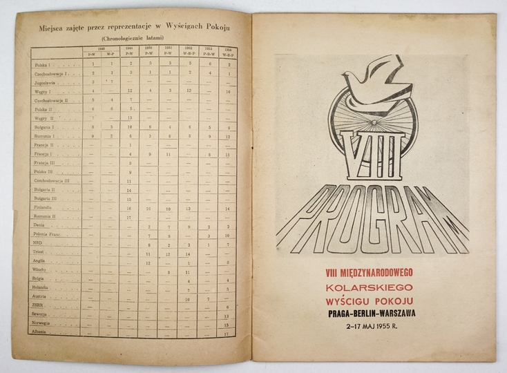 [WYŚCIG Pokoju]. Program VIII Międzynarodowego Wyścigu Pokoju Praga-Berlin-Warszawa, 2-17 maj 1955 r. Łódź 1955. Zakł. Graficzne RSW "Prasa". 4, s. 39, [1]. brosz.