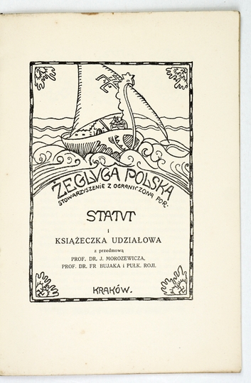 ŻEGLUGA Polska, stowarzyszenie z ograniczoną por[ęką]. Statut i Książeczka udziałowa, z przedmową J. Morozewicza, Fr. Bujaka i pułk. Roji. Kraków 1918. Druk. "Czasu". 8, s. 27, [4]. brosz.