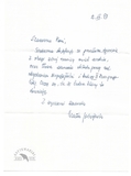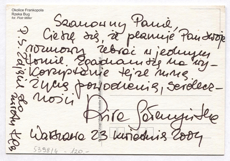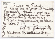 [GAŁCZYŃSKA Kira]. Pocztówka z odręcznym listem Kiry Gałczyńskiej do nieznanego adresata, dat. 23 IV 2004 w Warszawie.