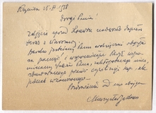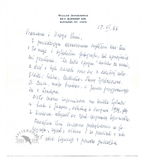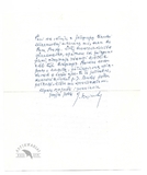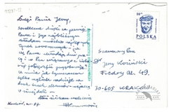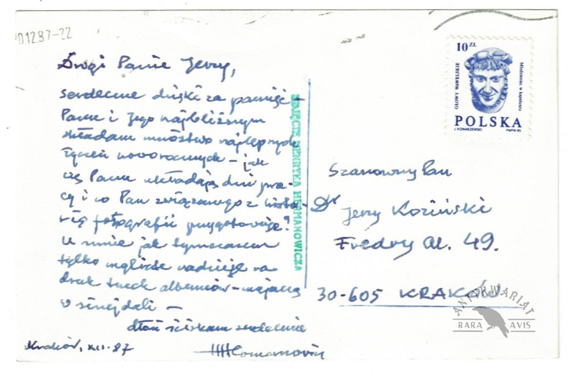 [HARASYMOWICZ Jerzy]. Odręczna korespondencja (na karcie pocztowej) Jerzego Harasymowicza do Jerzego Kozińskiego, dat. w XII 1987 w Krakowie.