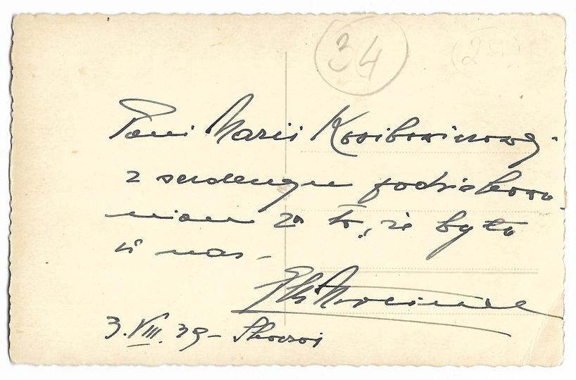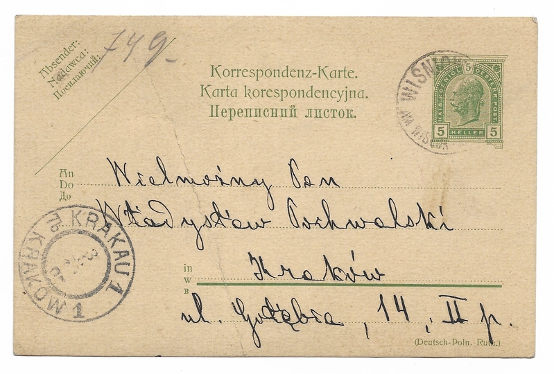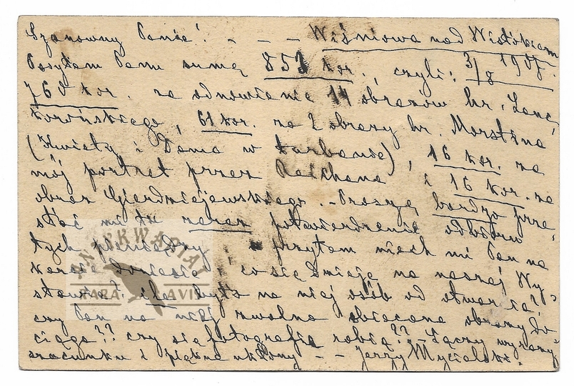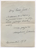 [MYCIELSKI Jerzy]. Karta korespondencyjna z odręcznym listem Jerzego Mycielskiego do malarza i konserwatora Władysława Pochwalskiego w Krakowie, dat. 3 VIII 1907 w Wiśniowej.