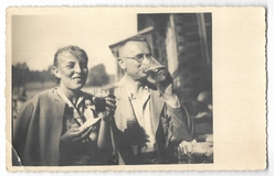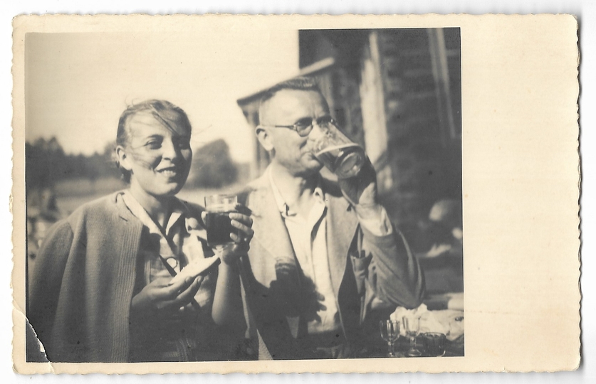 [MORCINEK Gustaw]. Odręczna dedykacja Gustawa Morcinka dla Marii Kosibowiczowej na odwrocie zdjęcia przedstawiającego pisarza z kuflem piwa, dat. 3 VIII 1939 w Skoczowie.