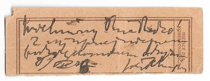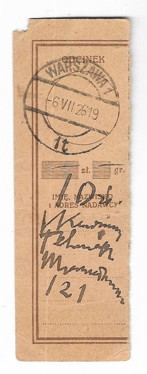 [PRZERWA-TETMAJER Kazimierz]. Odręcznie wypełniony przez Kazimierza Tetmajera odcinek pocztowego przekazu pieniężnego na 10 zł wysłanych 6 VII 1926 w Warszawie.