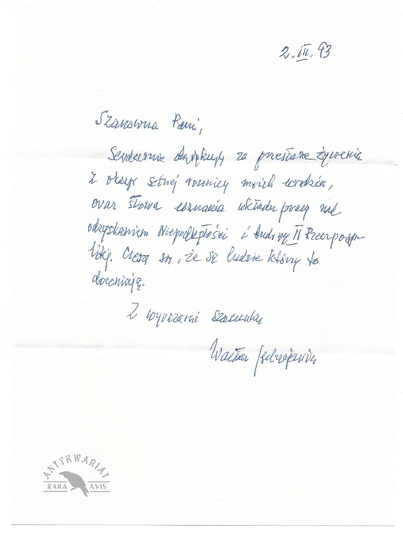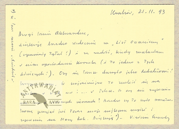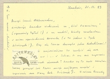 [SZYMBORSKA Wisława]. Wyklejanka z odręcznym listem Wisławy Szymborskiej do Aleksandra Rybczyńskiego w Toronto na odwrocie, dat. 21 XI (XII?) 1993 w Krakowie.