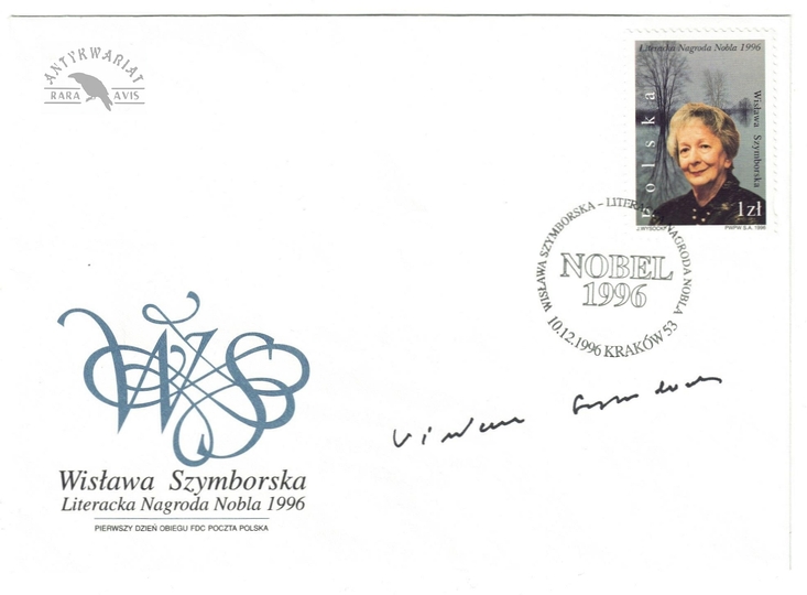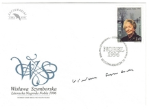 [SZYMBORSKA Wisława]. Podpis na kopercie Poczty Polskiej Pierwszego Dnia Obiegu FDC, z okazji przyznania jej Nagrody Nobla, dat. 10 XII 1996.