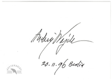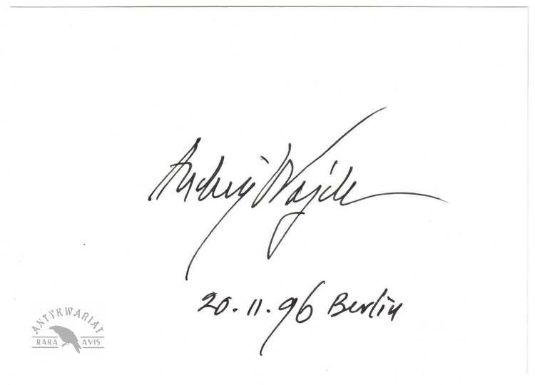 [WAJDA Andrzej]. Podpis Andrzeja Wajdy na karcie formatu pocztówkowego, dat. 20 II 1996.